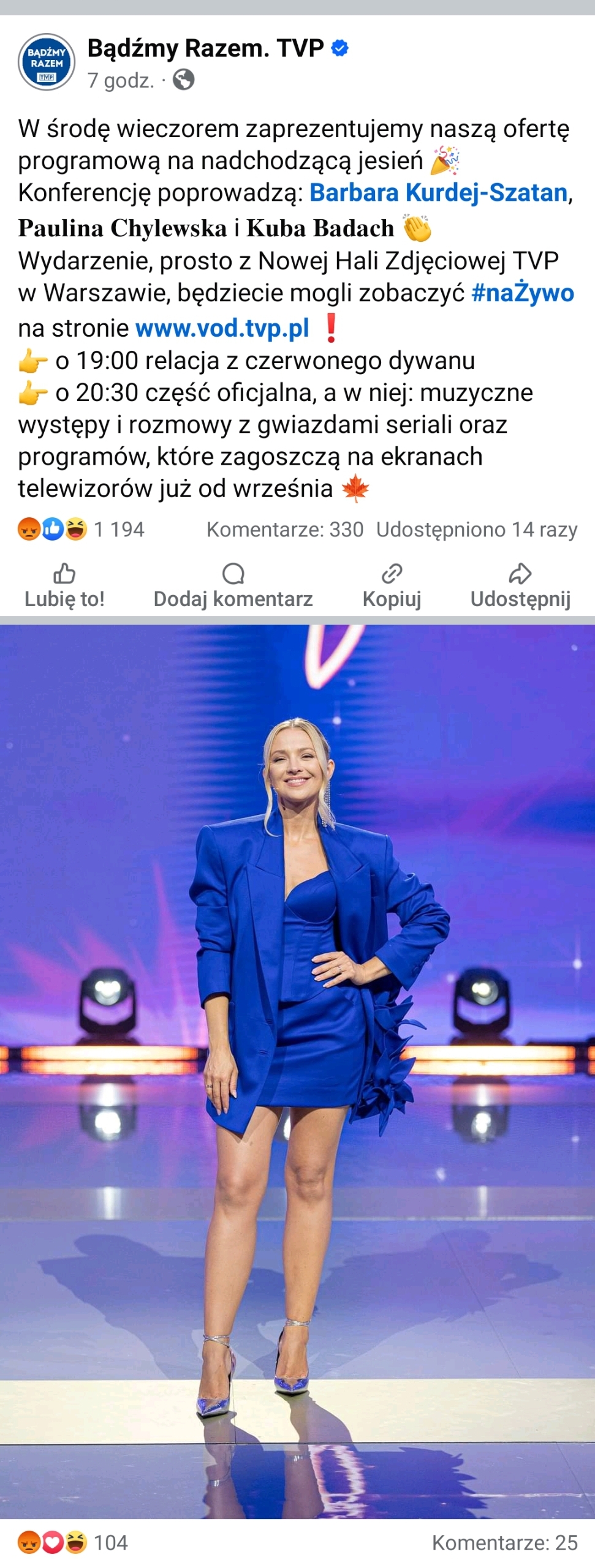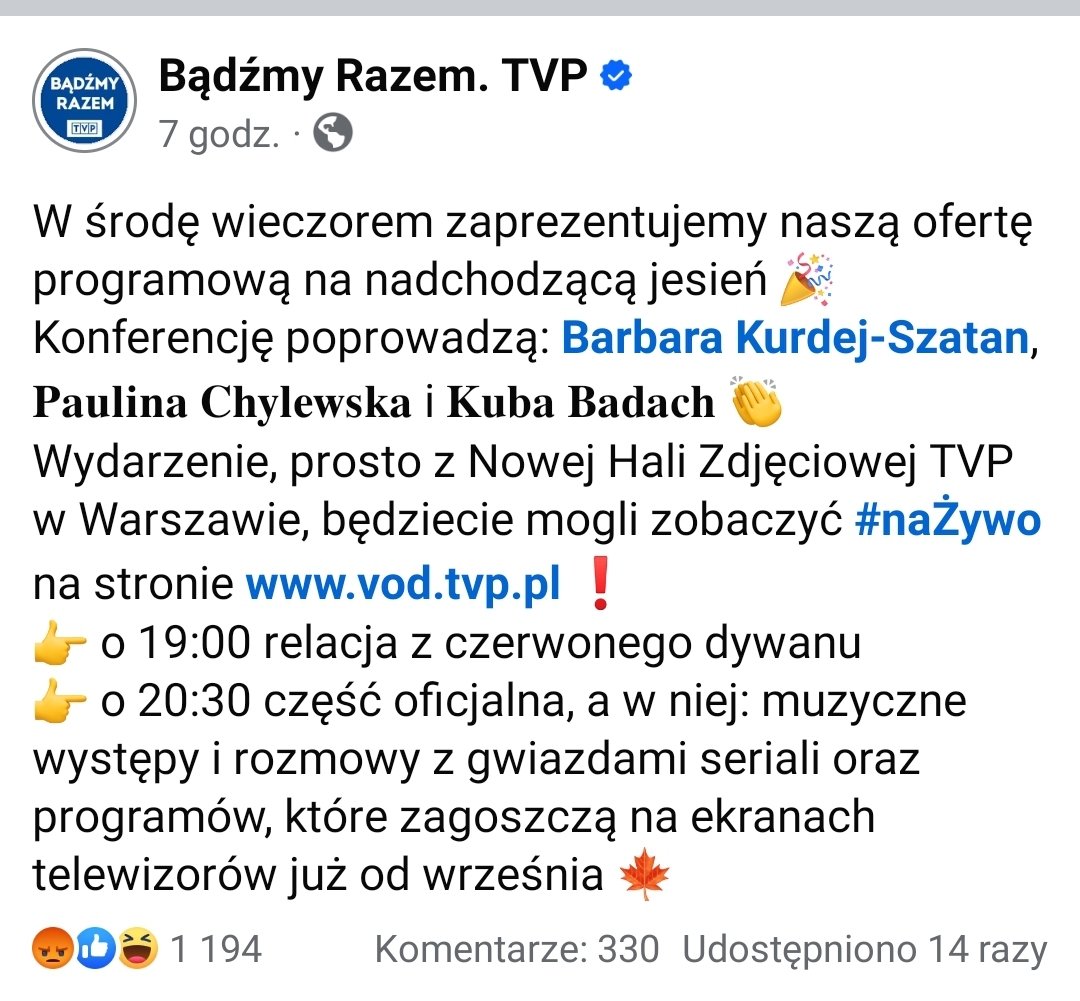 — W środę wieczorem zaprezentujemy naszą ofertę programową na nadchodzącą jesień. Konferencję poprowadzą: Barbara Kurdej-Szatan, Paulina Chylewska i Kuba Badach – czytamy.