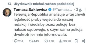 — Telewizja Republika analizuje w tej chwili legalność próby wejścia do naszej redakcji i siedziby przez policję bez nakazu sądowego, o czym sama policja dwukrotnie mnie informowała – czytamy w wpisie Tomasza Sakiewicza udostępnionym przez Michała Rachonia na portalu społecznościowym X.