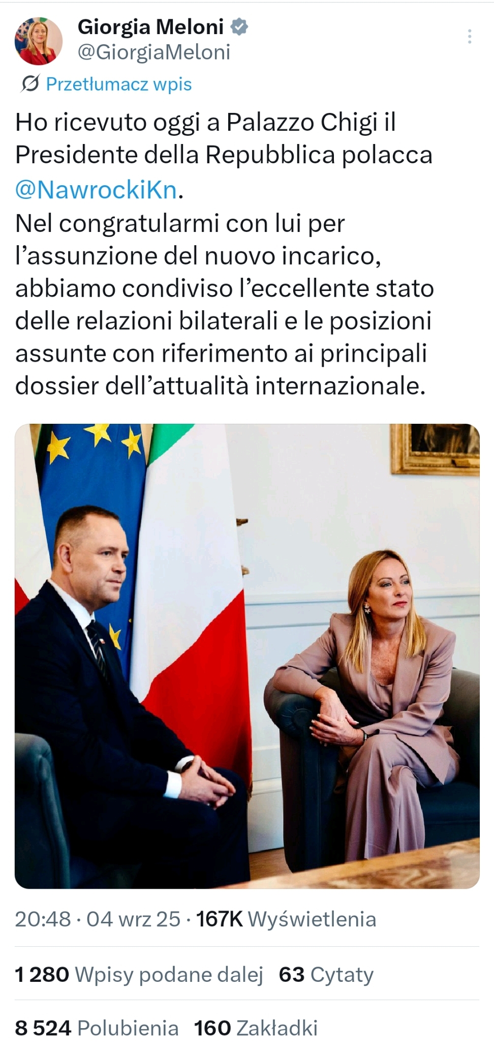— Prezydent RP Karol Nawrocki spotkał się z Premier Włoch Giorgią Meloni.To pierwsze, po zaprzysiężeniu na urząd Prezydenta RP, spotkanie Karola Nawrockiego z Szefową włoskiego rządu – czytamy w komunikacie Kancelarii Prezydenta na portalu społecznościowym X.